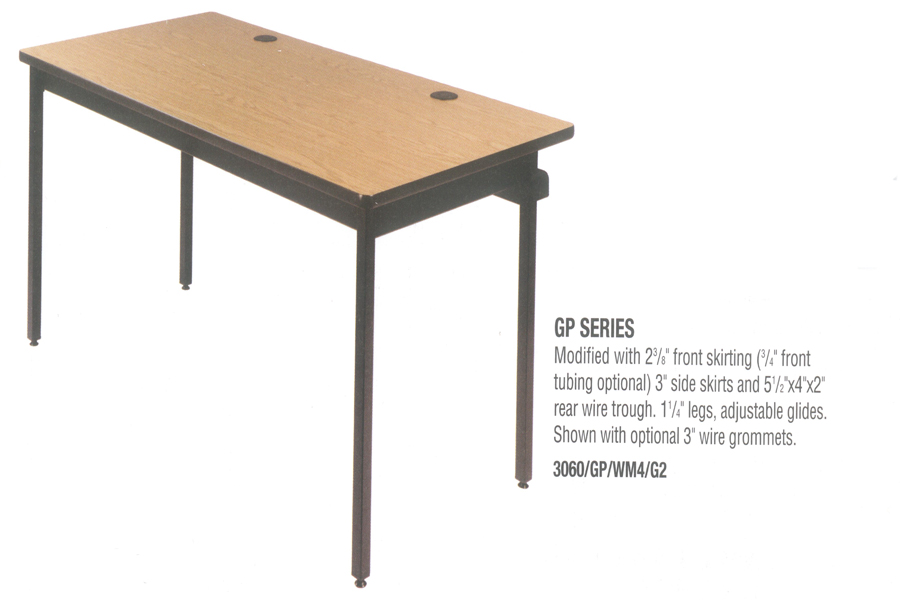 - Rear legs are tucked in under the table so that the 4″ trough nestless under the work surface while also allowing space for optional wire grommets.